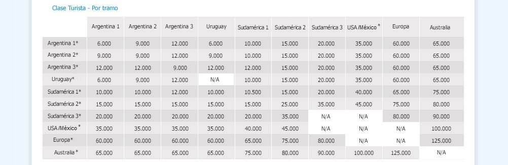Tabla de Millas Aerolineas Plus