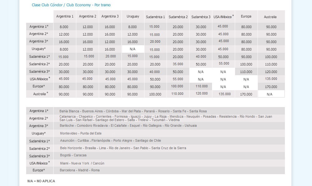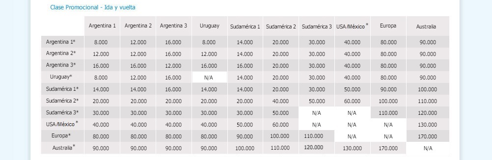 La emisión de pasajes de premio esta sujeto a la disponibilidad de asientos en la clase de premio solicitada y el total de millas debe estar disponible en el saldo de la cuenta. Las millas detalladas en la tabla de redención corresponden a los vuelos de Aerolíneas Argentinas y Austral. La oferta de asientos estará limitada según el destino. Una vez emitidos los billetes serán no endosables.